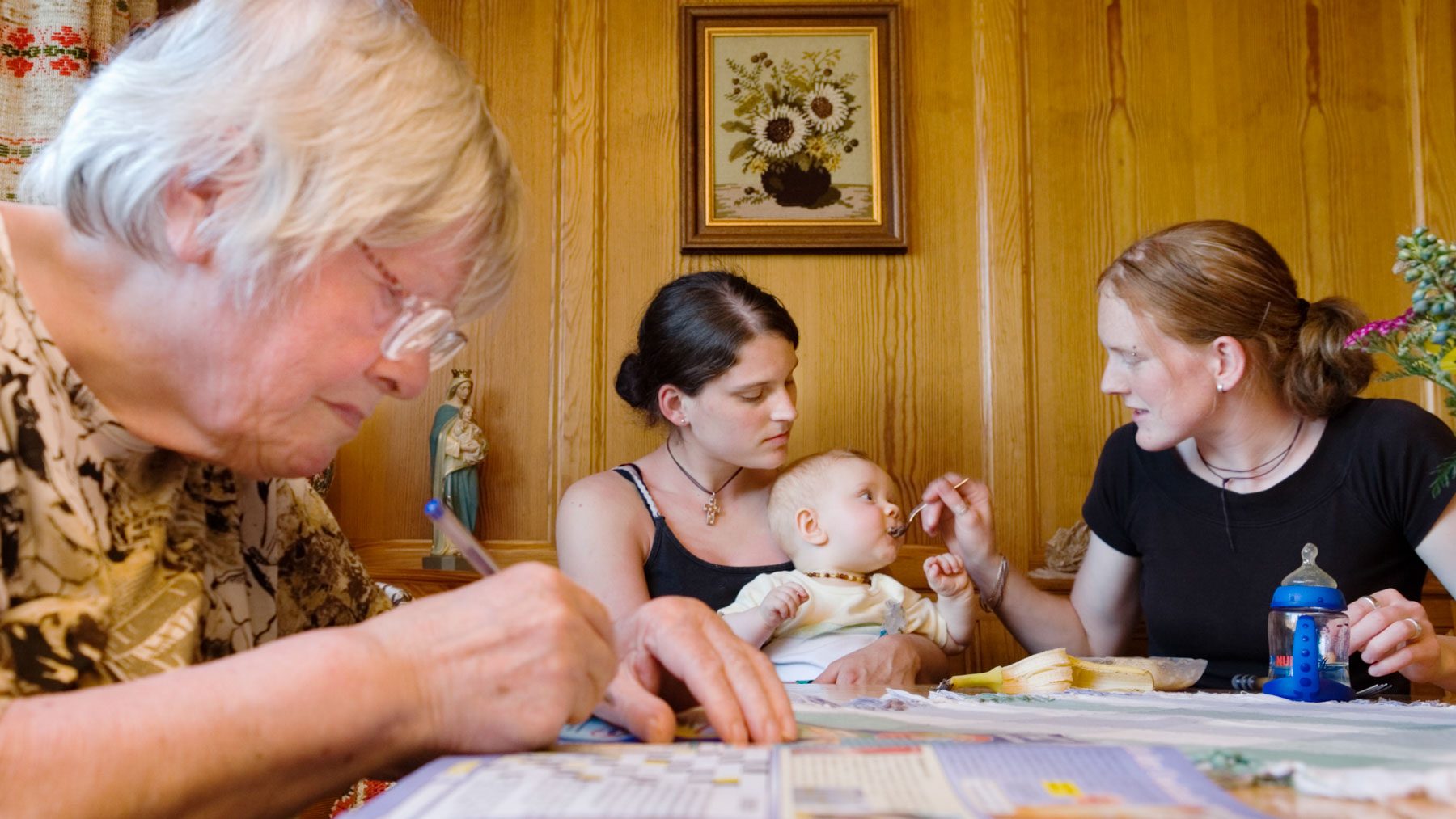 Bei meinem ersten Besuch, als dieses für mich fast ikonenhafte Bild entstand, fütterten ihre beiden neuen »Enkelinnen« den kleinen Urenkel Linus, während sie in aller Ruhe ein Kreuzworträtsel löste — ein berührendes Bild von echter Nähe und Zugehörigkeit.